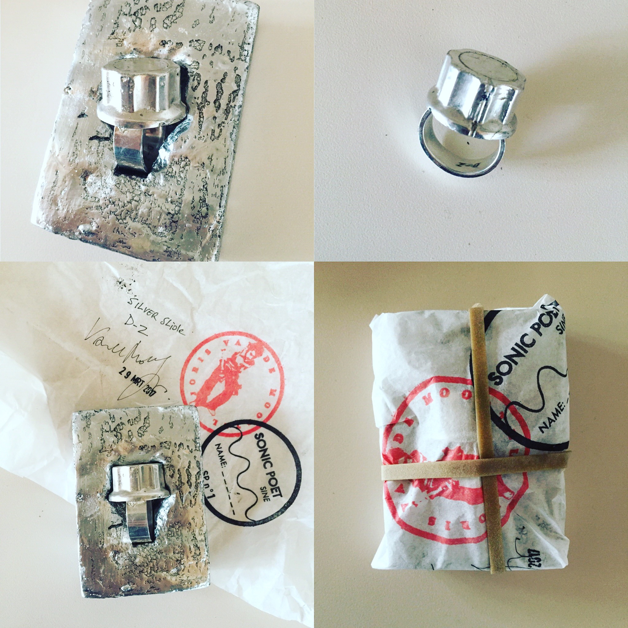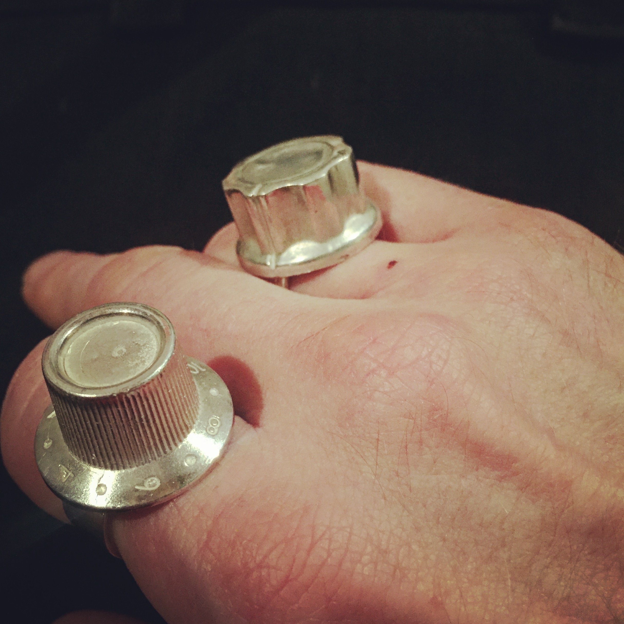 Ring casted in silver from a selection of volume, tone, gain, mid, bass or trebble buttons from various electric guitars and amplifiers